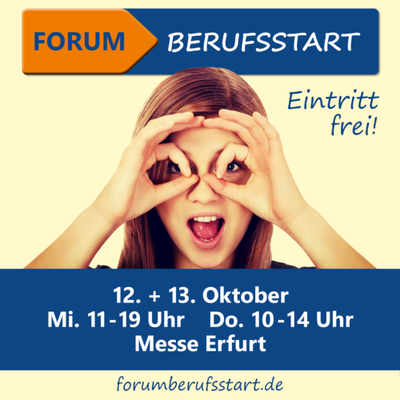 Am 12. und 13. Oktober 2022 sind wir auf der Forum-Berufsstart-Messe in Erfurt. Von 11 - 19 Uhr / 10 - 14 Uhr könnt ihr uns an unserem Messestand Nr. 150 besuchen.