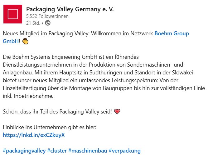 Die Boehm Group GmbH ist ein führendes Dienstleistungsunternehmen im Sondermaschinen- und Anlagenbau. Mit 150 Mitarbeitenden zählt das Unternehmen zu einem der großen Arbeitgeber der Region. Das Leistungsspektrum reicht von der Einzelteilfertigung über die Montage von Baugruppen bis hin zu kompletten Linie inklusive Inbetriebnahme. Besonders in den Bereichen Pharma, Medizintechnik und Produkte des täglichen Bedarfs hat sich die Boehm Group mit technischer Exzellenz, hoher Flexibilität und professionellem Projektmanagement etabliert.